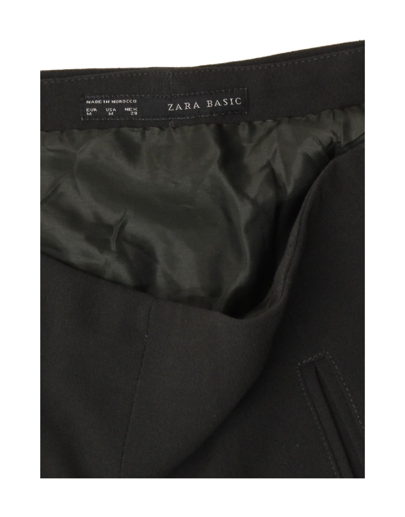 - Description de l'IA : Cette jupe trapèze pour femme Zara est confectionnée dans un tissu tissé noir lisse, offrant une texture raffinée. Il présente une silhouette trapèze classique avec une couture subtile sur le devant. La jupe est entièrement doublée pour plus de confort et une finition soignée. Une fermeture zippée discrète sur le côté assure un profil élégant. Les poches pratiques sont parfaitement intégrées au design. La coupe régulière offre un port confortable et polyvalent.