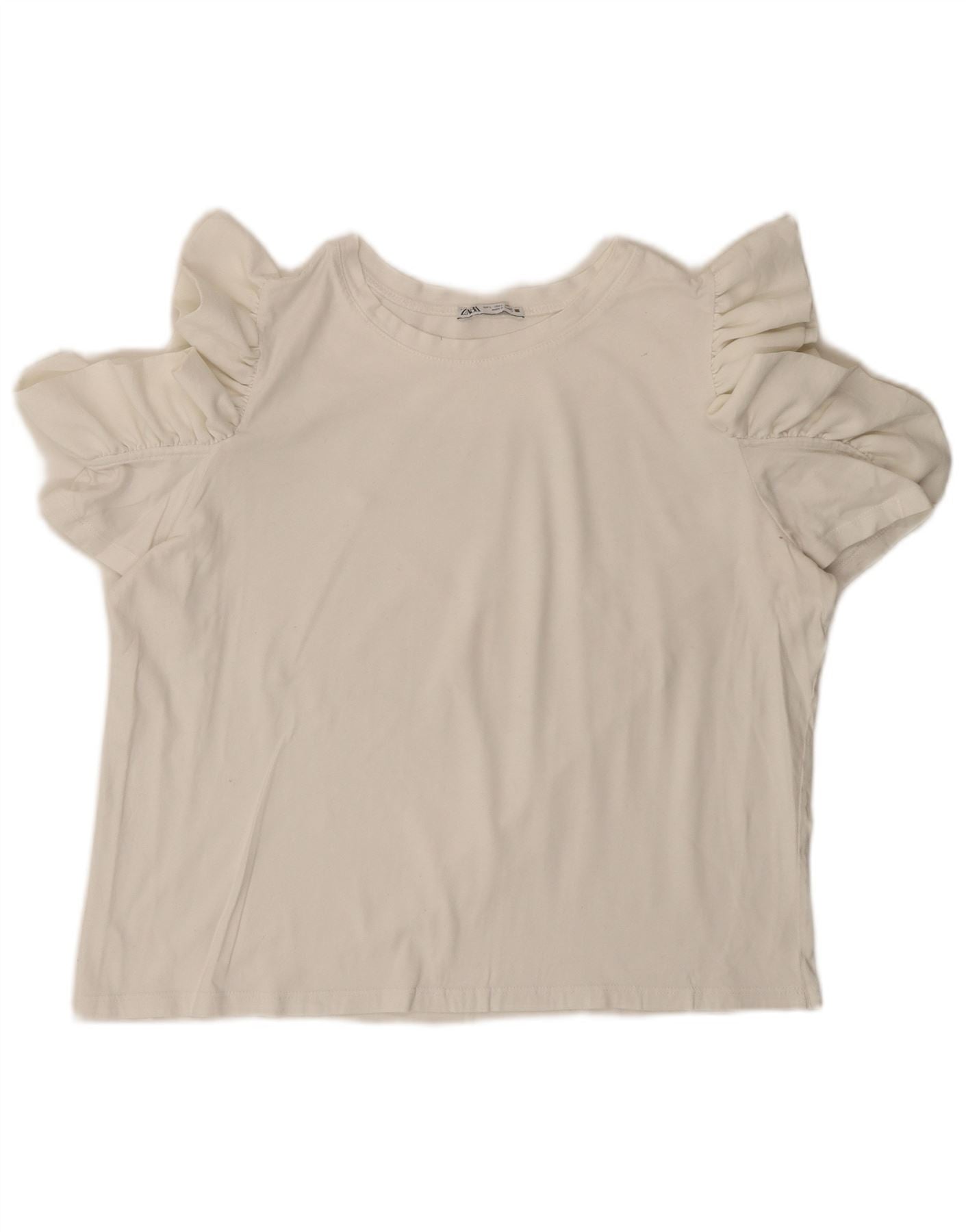 - Description de l'IA : Ce haut T-shirt pour femme Zara est confectionné dans un tissu en jersey blanc doux. Il présente une encolure ronde classique et une coupe régulière confortable. Les manches courtes sont rehaussées de délicats volants, ajoutant une touche moderne et féminine. Ce style pull offre un port et un confort sans effort, parfait pour l'élégance au quotidien.