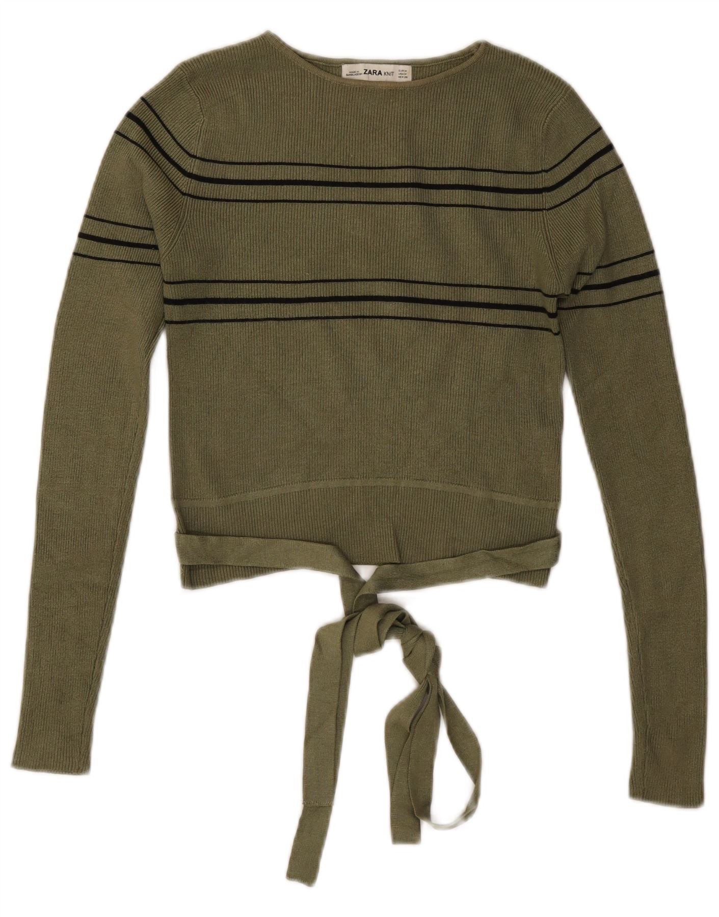 ZARA Pull court à col bateau pour femme UK 12 Kaki moyen rayé
