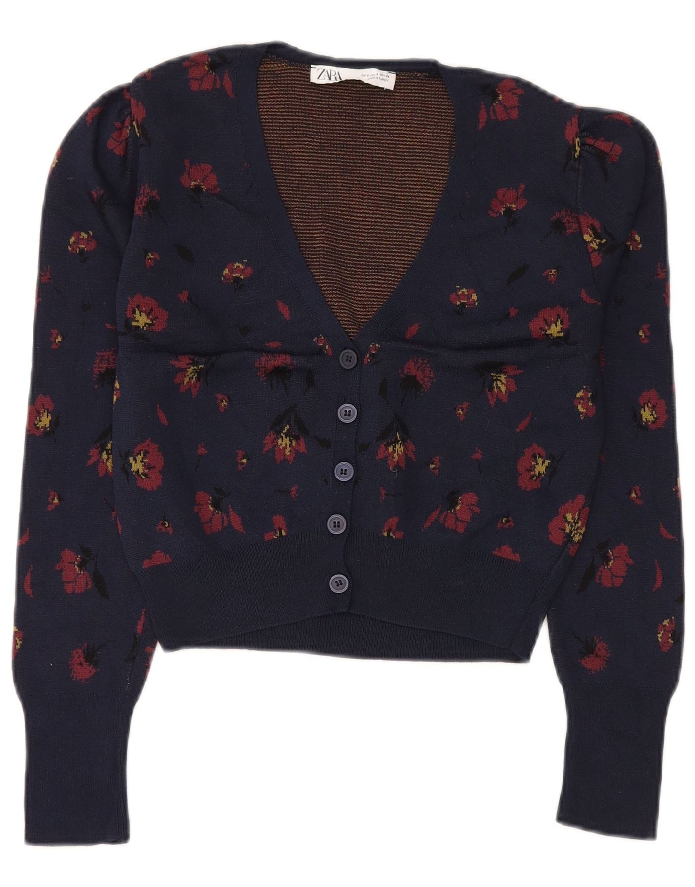 ZARA Womens Crop Cardigan Sweater UK 10 Petit Bleu Marine Floral Polyamide