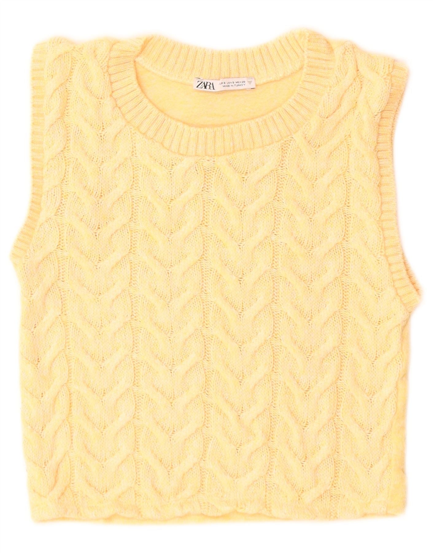 - Description de l'IA : Ce gilet jaune pour femme Zara est confectionné à partir d'un tissu tricoté doux, présentant une texture tricotée torsadée distinctive. Il présente une encolure ronde classique et un design sans manches. La coupe régulière offre un port confortable. Le motif en tricot torsadé offre un riche intérêt visuel. Sa longueur raccourcie ajoute une touche moderne.