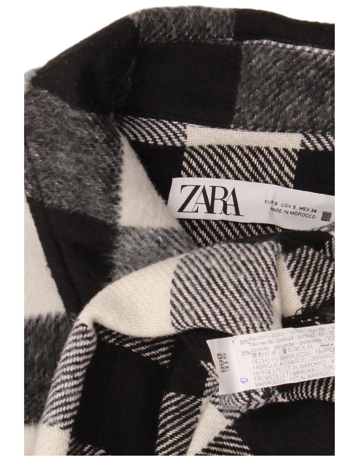 - Description de l'IA : Cette veste pour femme Zara est confectionnée dans un tissu en coton mélangé doux avec une texture sherpa confortable. Il présente un motif à carreaux noir et blanc audacieux. L'encolure à col et le devant boutonné offrent des détails classiques. Il présente une coupe décontractée et ample avec une longueur courte moderne. Des manches longues et des poches avant complètent le design, offrant à la fois style et praticité.