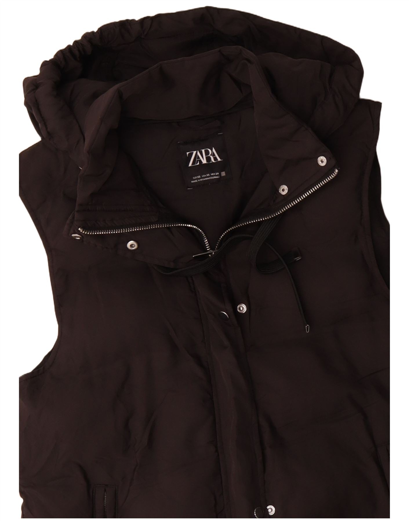 ZARA Gilet rembourré long à capuche surdimensionné pour femme UK 6 XS Marron Polyester