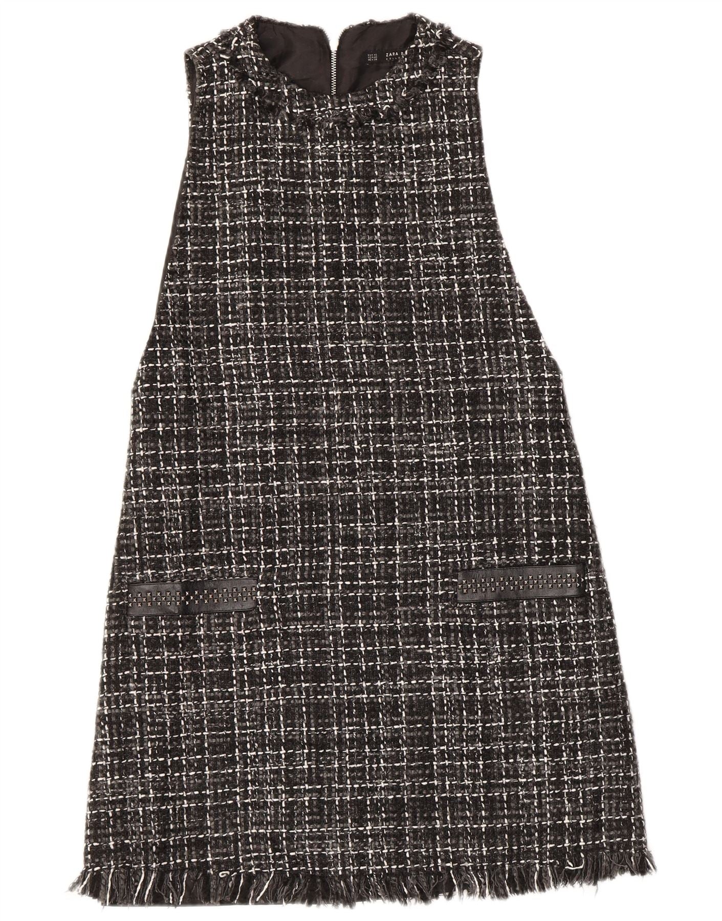 - Description de l'IA : Cette robe droite Zara pour femme est confectionnée à partir d'un tricot en tweed noir et blanc, avec un motif à carreaux texturé. Il présente un col haut et un design sans manches, créant une silhouette élégante. La coupe décontractée assure un port confortable. Une fermeture éclair à l'arrière offre une finition soignée. L'ourlet est accentué par une frange élégante, ajoutant une touche contemporaine. Cette robe est entièrement doublée pour plus de confort et de structure.