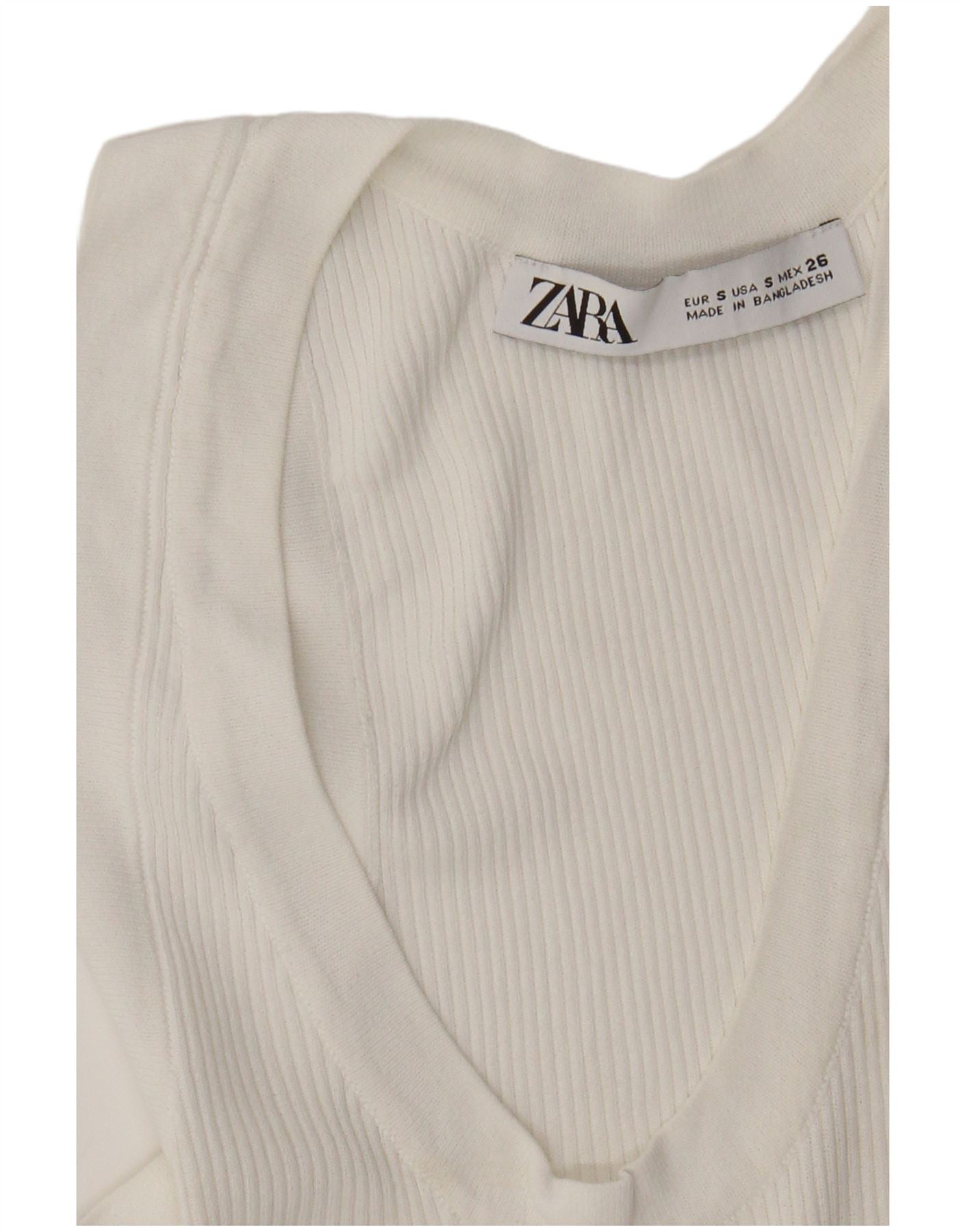- Description de l'IA : Ce débardeur Zara pour femme est confectionné dans un tissu tricoté côtelé blanc cassé confortable. Il présente un décolleté en V flatteur et un design sans manches, idéal pour les superpositions ou par temps chaud. La coupe slim offre une silhouette épurée, rehaussée par ses propriétés extensibles pour un confort ultime. Ce style de pull est un essentiel polyvalent de votre garde-robe, alliant attrait classique et portabilité moderne.